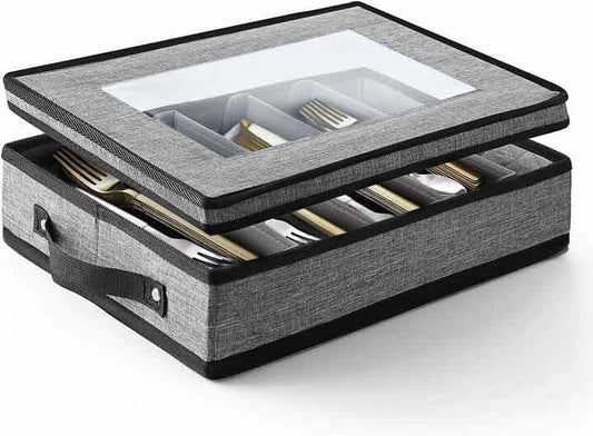 Flatware & Utensil Storage, Durable Silverware Storage Box with Padded Dividers, 5 Compartment Flatware Storage Case, Silverware Case with Handles, Protects and Organizes Cutlery, Grey