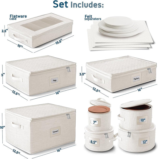 Fine China Storage Containers, 8 Piece Quilted Dish Storage Containers for Flatware & Utensil, Mug, Platter and Wine Glass with Felt Dividers, Durable Dinnerware Dish Organizers for Moving, Cream
