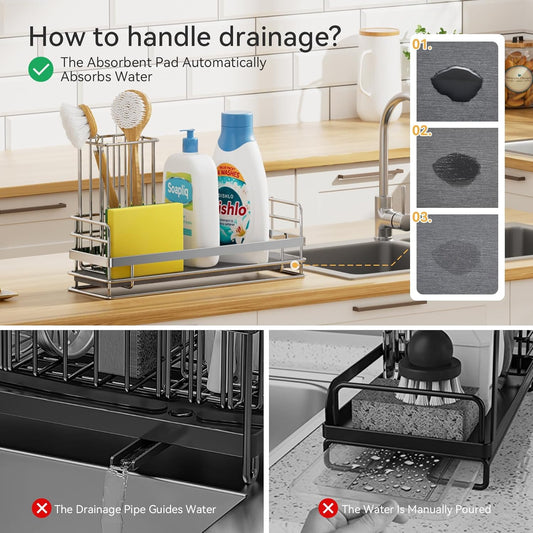 SWTYMIKI Sink Caddy Sponge Holder - Large Sponge Holder for Kitchen Sink with 360°Auto-Drain Tray, Rustproof Stainless Steel Kitchen Organizer Caddy for Countertop Organization