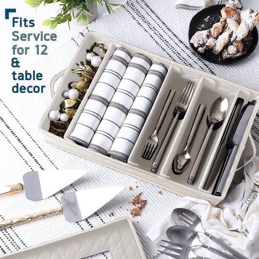 Flatware & Utensil Storage, Durable Silverware Storage Box with Padded Dividers, 5 Compartment Flatware Storage Case, Silverware Case with Handles, Protects and Organizes Cutlery, Cream