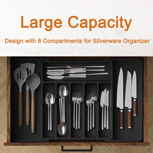 Kitchen Silverware Organizer for Drawer - Expandable Silverware Drawer Organizer Adjustable Utensil Drawer Holder, Flatware Cutlery Tray for Spoons Forks Kitchen Organizers Storage,Black,M