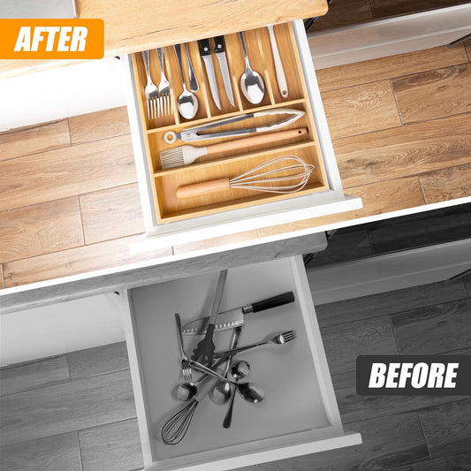 Silverware Organizer - Expandable Silverware Tray for Drawer, Adjustable Utensil Drawer Organizer for Forks, Knives, Kitchen Organizers and Storage, White