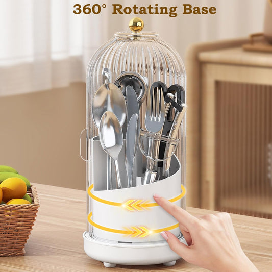 JEESA Utensil Holder with Lid, 360° Rotating Flatware Organizer for Cutlery Spoon Fork(H Less 8"), Silverware Caddy Organizer Drainage Dustproof Flatware Holder Kitchen Countertop Storage, White