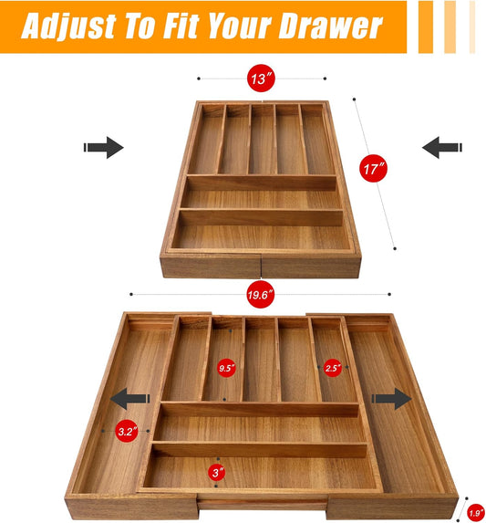 Bellsal Large Premium Acacia Wood Silverware Organizer - Expandable Utensil Drawer Organizer - 17"x19.6" Utensil Holder and Cutlery Tray with Grooved for Kitchen Flatware Utensils(7-9 Slot, Acacia)