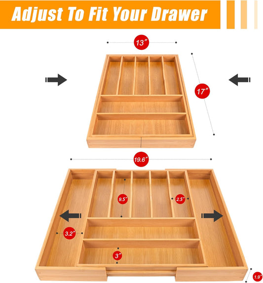 Bellsal Large Premium Bamboo Silverware Organizer - Expandable Utensil Drawer Organizer - 17"x19.6" Utensil Holder and Cutlery Tray with Grooved for Kitchen Flatware and Utensils Mother's Day Gift