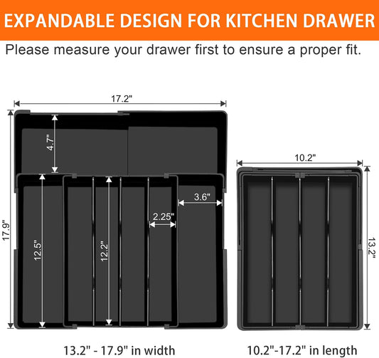Silverware Organizer - Expandable Kitchen Drawer Organizer BPA-Free Silverware Drawer Organizer, Stackable Cutlery Tray for Forks, Knives, Slim Kitchen Organizers and Storage, Black, Large