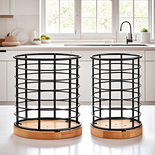 2-Piece Metal Kitchen Utensil Holder Set, Black Crocks with Wooden Bases, 5.1"×5.1"×5.8" & 3.7"×3.7"×5.8" Sizes