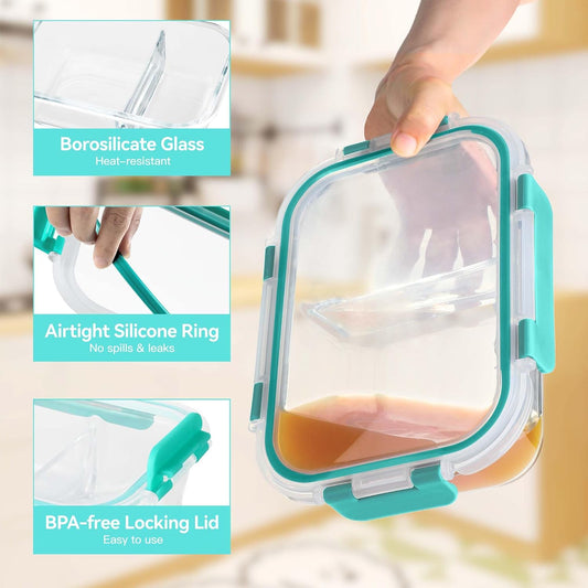 BAYZZ 5 Pack 35 Oz Glass Meal Prep Containers 2 Compartments, Glass Storage Containers with Lids, Airtight Lunch Bento Boxes, BPA-Free, Microwave and Freezer Safe,Green