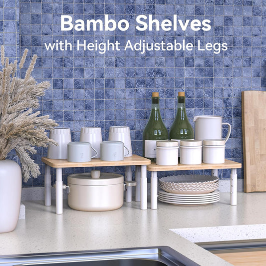 Cabinet Organizer Shelf, Spice Rack Set of 2 Kitchen Pantry Cupboard Shelves, Stackable, Height Adjustable, Natural Bamboo (15.6" Wx77.Dx6.57 H per Pack)