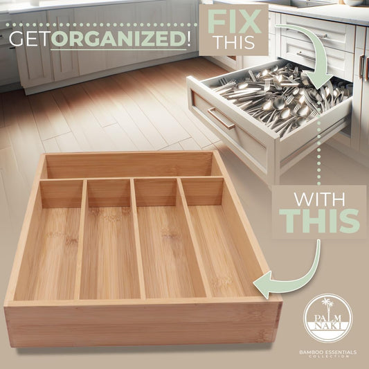 PALM NAKI Silverware Organizer Premium Bamboo Cutlery Organizer Tray - Kitchen Drawer Organizer for Silverware, Utensils - Flatware Organizers - Kitchen Organization (Natural Classic, 5 Slots)