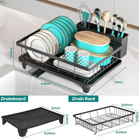 MERRYBOX Dish Drying Rack Space-Saving Dish Racks for Kitchen Counter, Rustproof Drying Rack Kitchen with Large Utensil Holder and Increased Feet, 16.5" D x 11.4" W x 5.65" H, Black