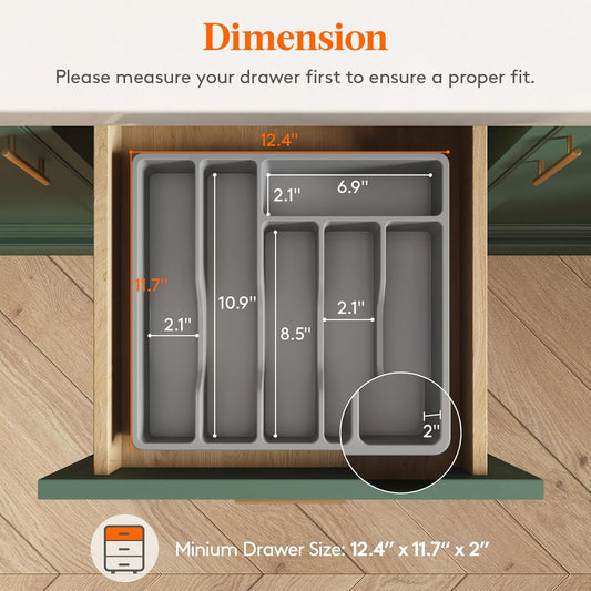 Lifewit Silverware Drawer Organizer Tray, Plastic Cutlery Storage for Kitchen Drawer, Flatware and Utensil Holder Divider for Spoons Forks Knives Tableware, 6 Compartment, Gray