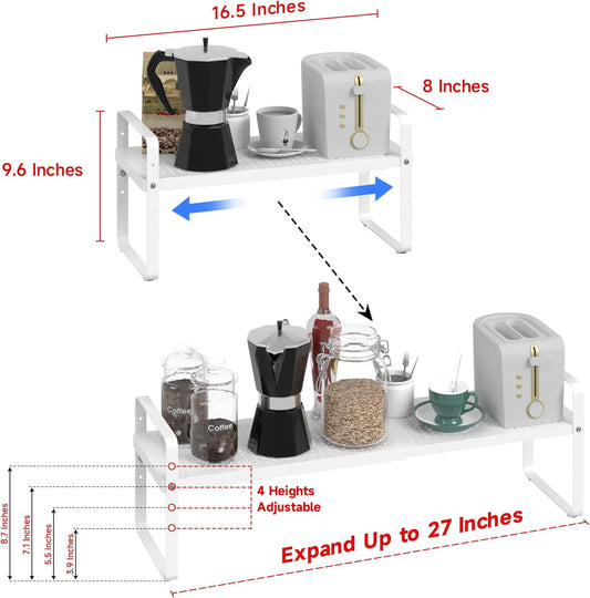 Expandable Cabinet Shelf Organizer Adjustable Metal Spice Rack Stackable Freestanding Counter Storage Shelves for Kitchen Cabinet Under Sink Office Desk (White - 2Pack - L16.5-27'' * W10.2'' * H9.6'')