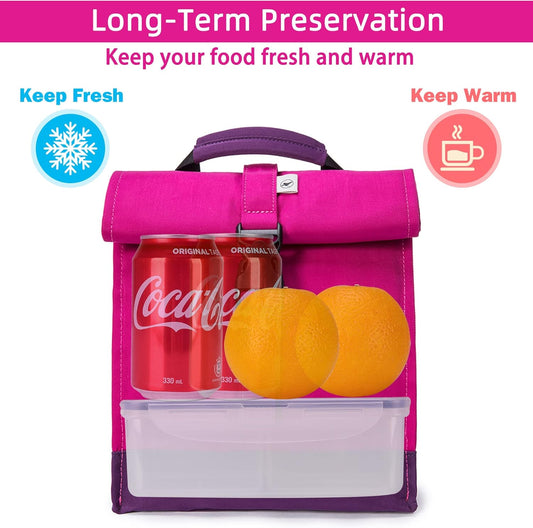 SUNNY BIRD Insulated Lunch Bag Rolltop Lunch Box Tote Lunchbox Bag for Women, Girls, Teens and Kids (Purple)