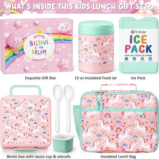 Fimibuke Kids Bento Snack Lunch Box with 4 Compartments, Insulated lunch Bag, Stainless Steel Thermos Food Jar, Ice Pack & Utensils, Unicorn Birthday Gift for Age 3-12 Back to School Toddler Girl Boy