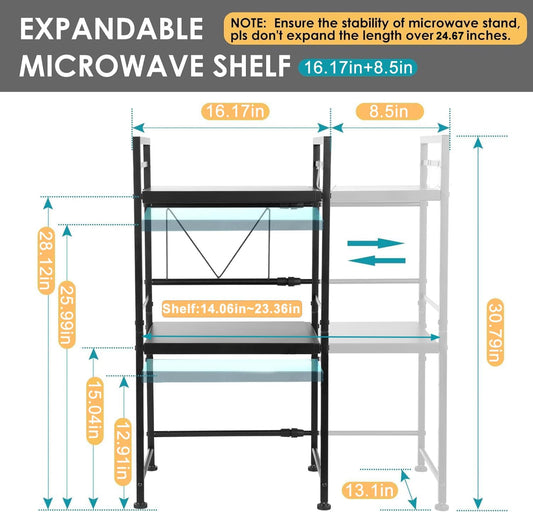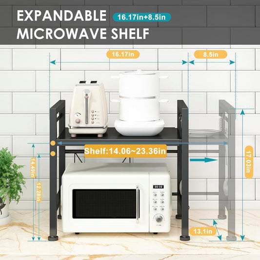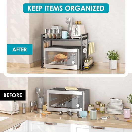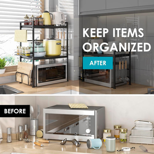 DOLALIKE Microwave Oven Rack, Expandable Microwave Stand Countertop Kitchen Utensils Tableware Storage, Carbon Steel Over Microwave Shelf Countertop with 3 Hooks