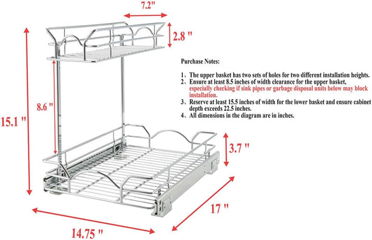 2 Tier Pull Out Cabinet Organizer 15" W X 22" D, Slide Out Drawers For Kitchen Cabinets, Pull Out Drawers For Cabinets Capacity Heavy Duty Caddy, Cabinet Pullout Shelves Chrome-Plated,Bathroom Pantry