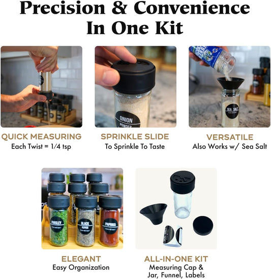 Glass Spice Jars & Measuring Cap Set - Twist to Dispense 1/4 Tsp Per Turn for Precise Cooking - Glass Jars with Lids Keep Kitchen Organized & Tidy - Enjoy Round Spice Jar Without Mess-12Pack