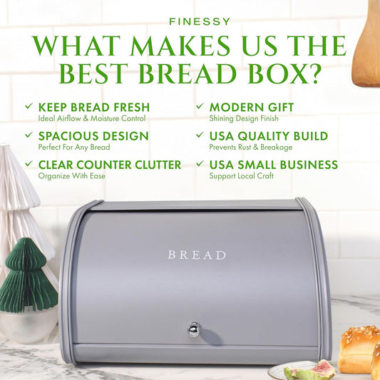 FINESSY Modern Metal Bread Box for Kitchen Countertop, Farmhouse Homemade Loaf Bread Storage Bin Holder for Kitchen Counters Organizer, Airtight Roll Top Sourdough Corner Breadbox Container Keeper