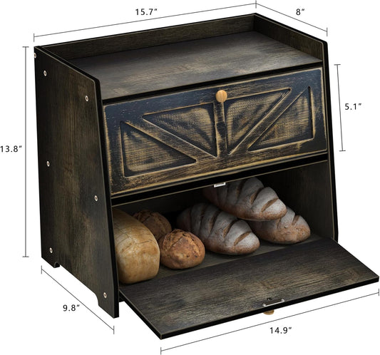 Vintage Double Layer Bread Box for Kitchen Counter Bamboo Bread Storage Container Large Capacity Bread Storage Bin (Antique Black)