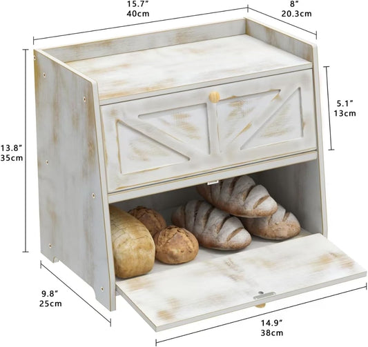 Vintage Double Layer Bread Box for Kitchen Counter Bamboo Bread Storage Container Large Capacity Bread Storage Bin (Antique White)