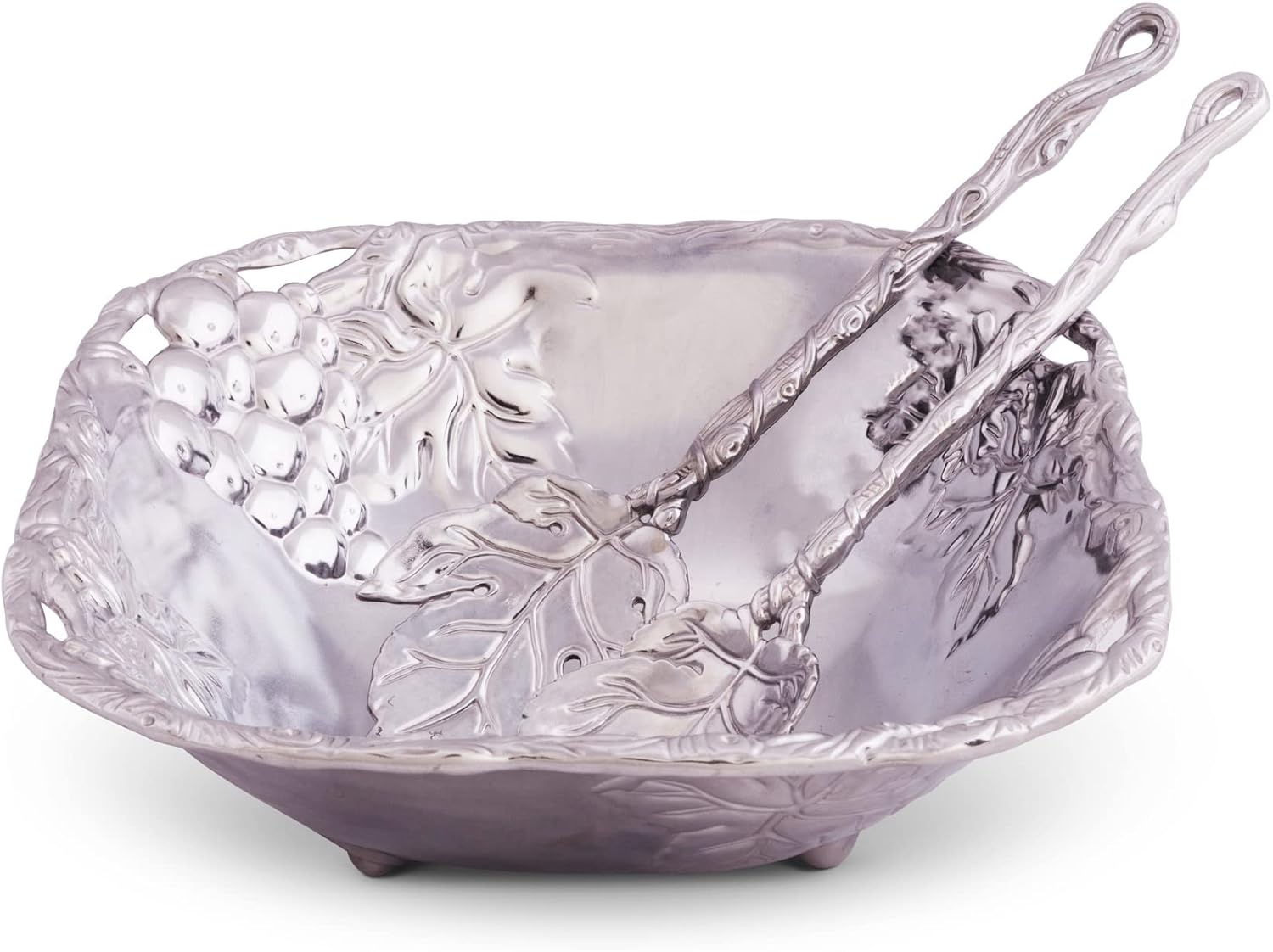 Arthur Court Designs Metal 3-Pc Grape Salad Set Bowl and Server in Grape Pattern Sand Casted in Aluminum with Artisan Quality Hand Polished Design Tarnish-Free 9.5 Inch Diameter