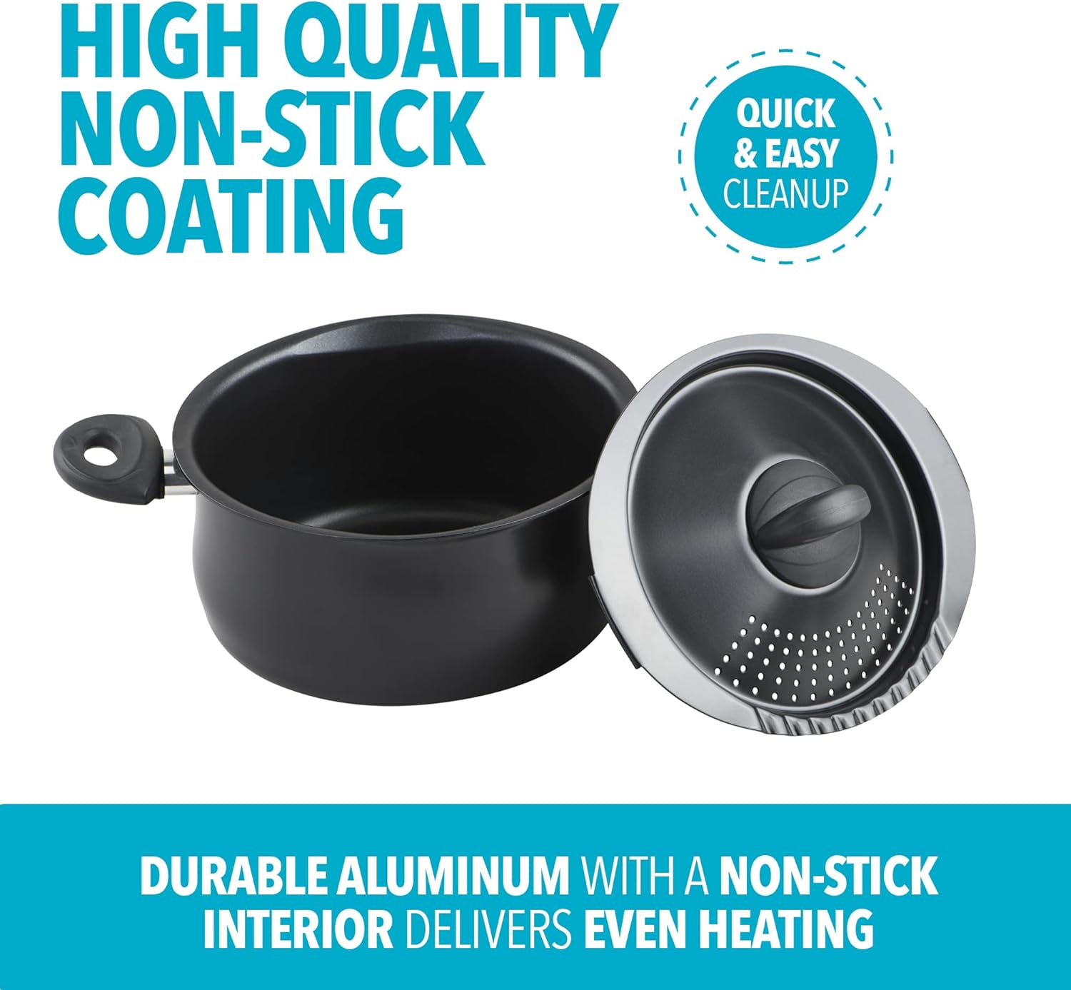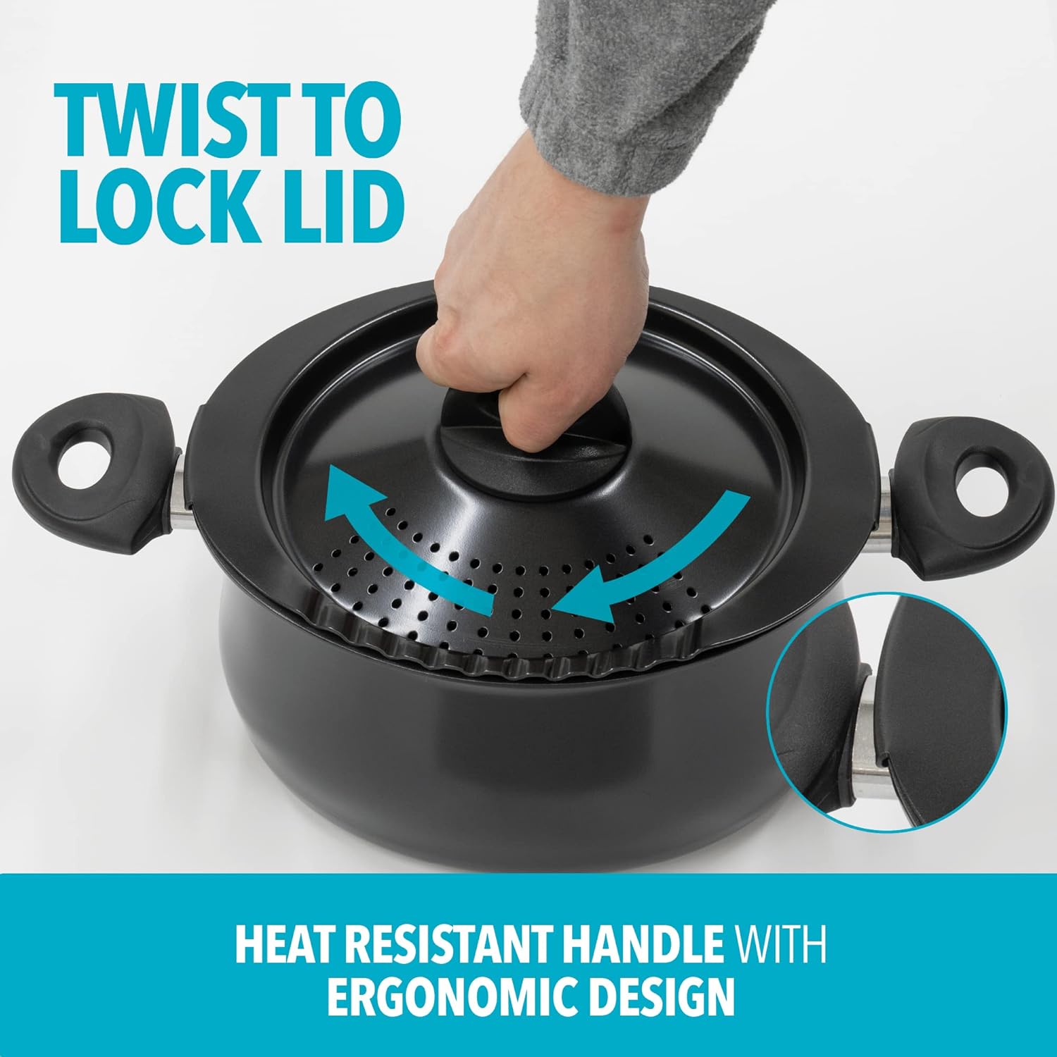 - STRAINER LID: Pot's lid twists and locks into place securely and features integrated straining holes for additional safety and convenience when draining excess water out of the pot
