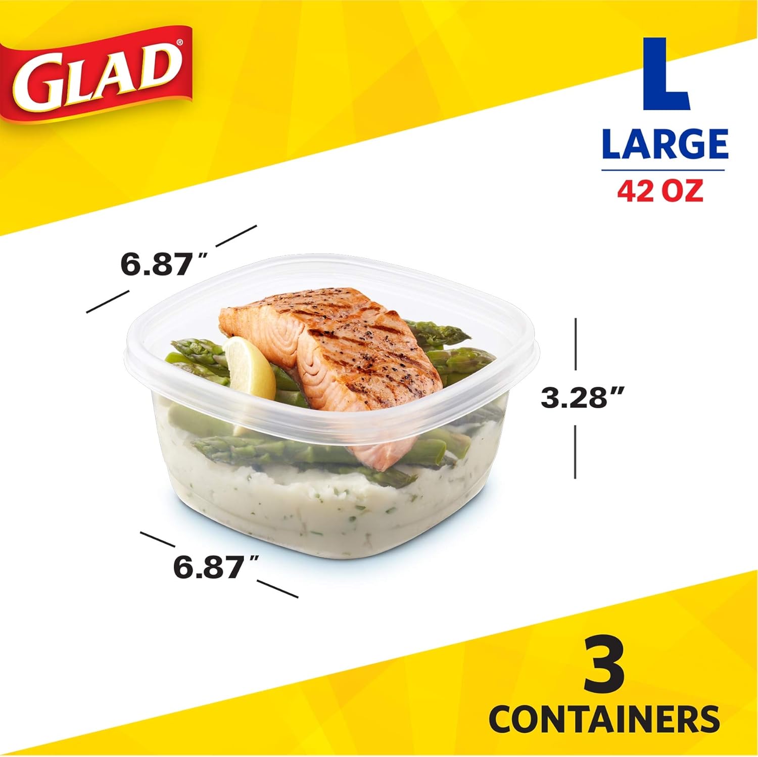- GLAD FOOD STORAGE CONTAINERS WITH LIDS: With over 5 cups of storage, Glad Tall Entrée large square plastic food containers are perfect for storing and serving meals, with lids to keep a tight seal and prevent messy spills