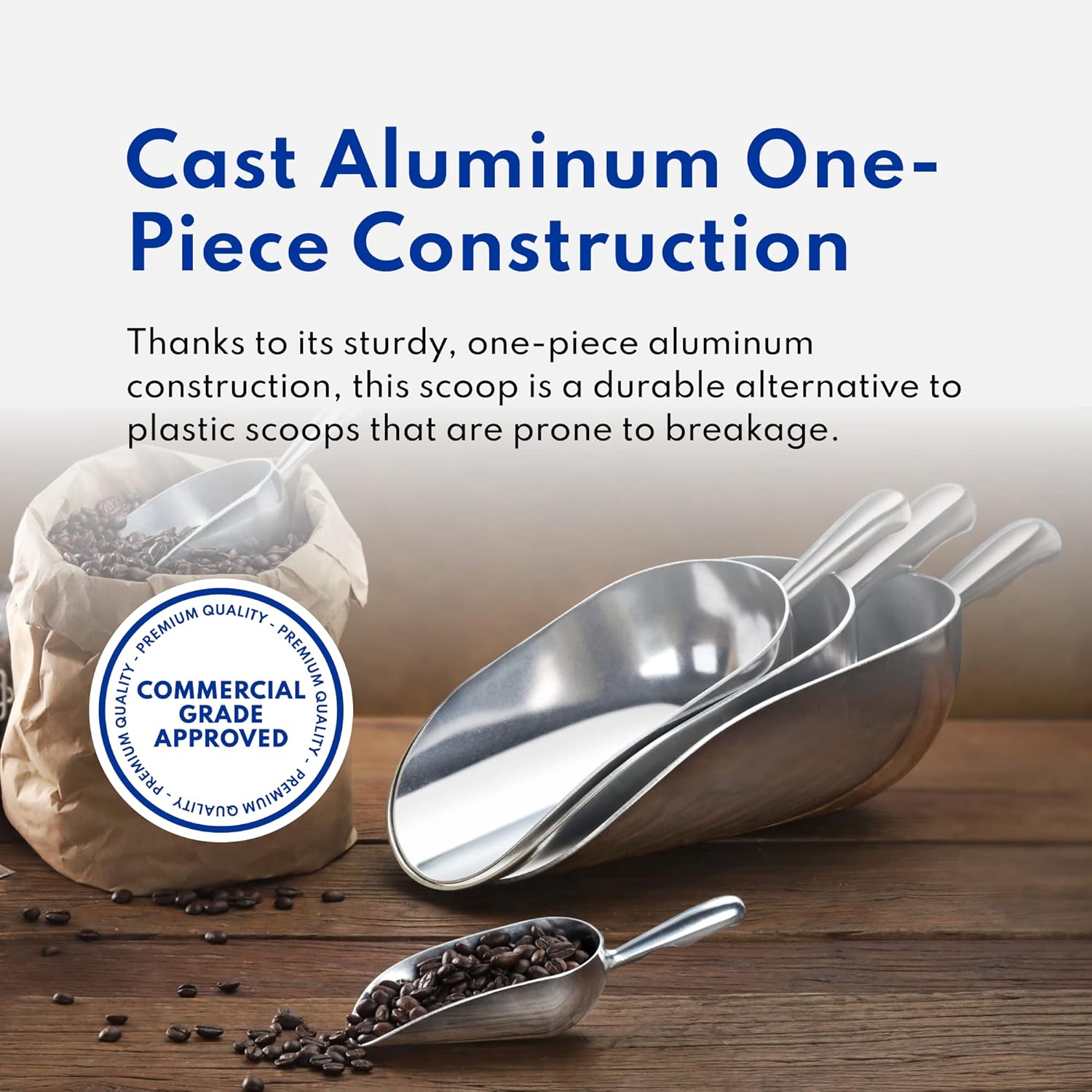 - One-piece aluminum construction, this scoop is a durable alternative to plastic scoops that are prone to breakage.