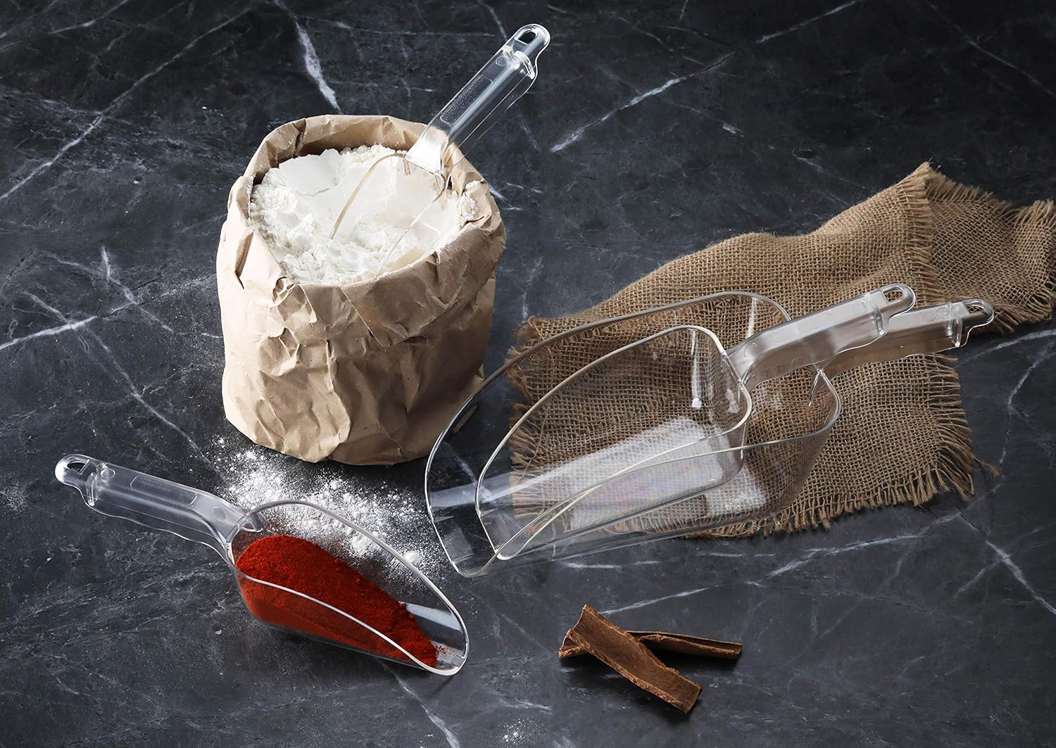 - Thanks to this scoop's flat bottom, it is easier than ever to scoop ingredients from the bottom of bins and corners.
