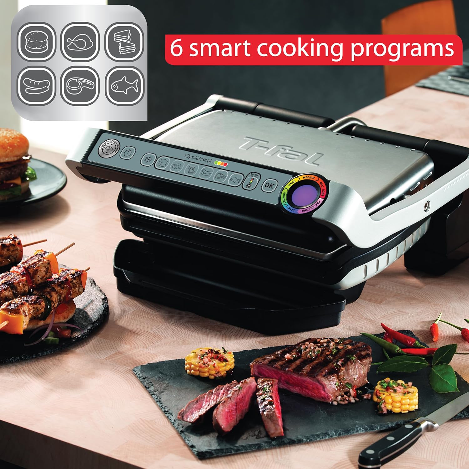 - 6 Automatic Cooking Programs: Effortlessly grill burgers, poultry, fish, sandwiches, and more with pre-programmed settings. Simply select the food type, and the OptiGrill XL adjusts temperature and cooking time for optimal results