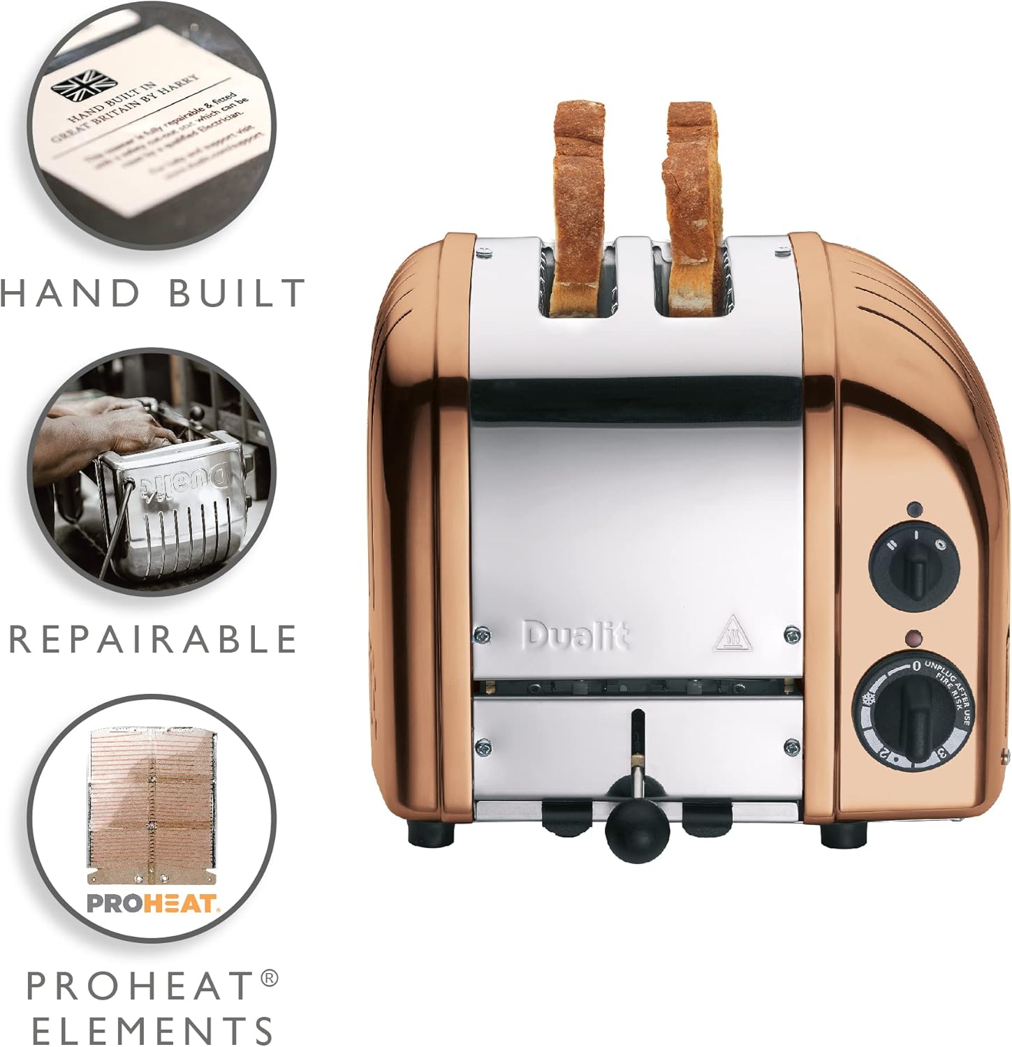 - PROHEAT ELEMENTS - Exclusive to Dualit, ProHeat elements have a protective, armour-plated layer making them virtually unbreakable. Giving you a longer working life than traditional wire element toasters, with a superior heat spread and tastier toast, muffins, sandwiches or teacakes.
