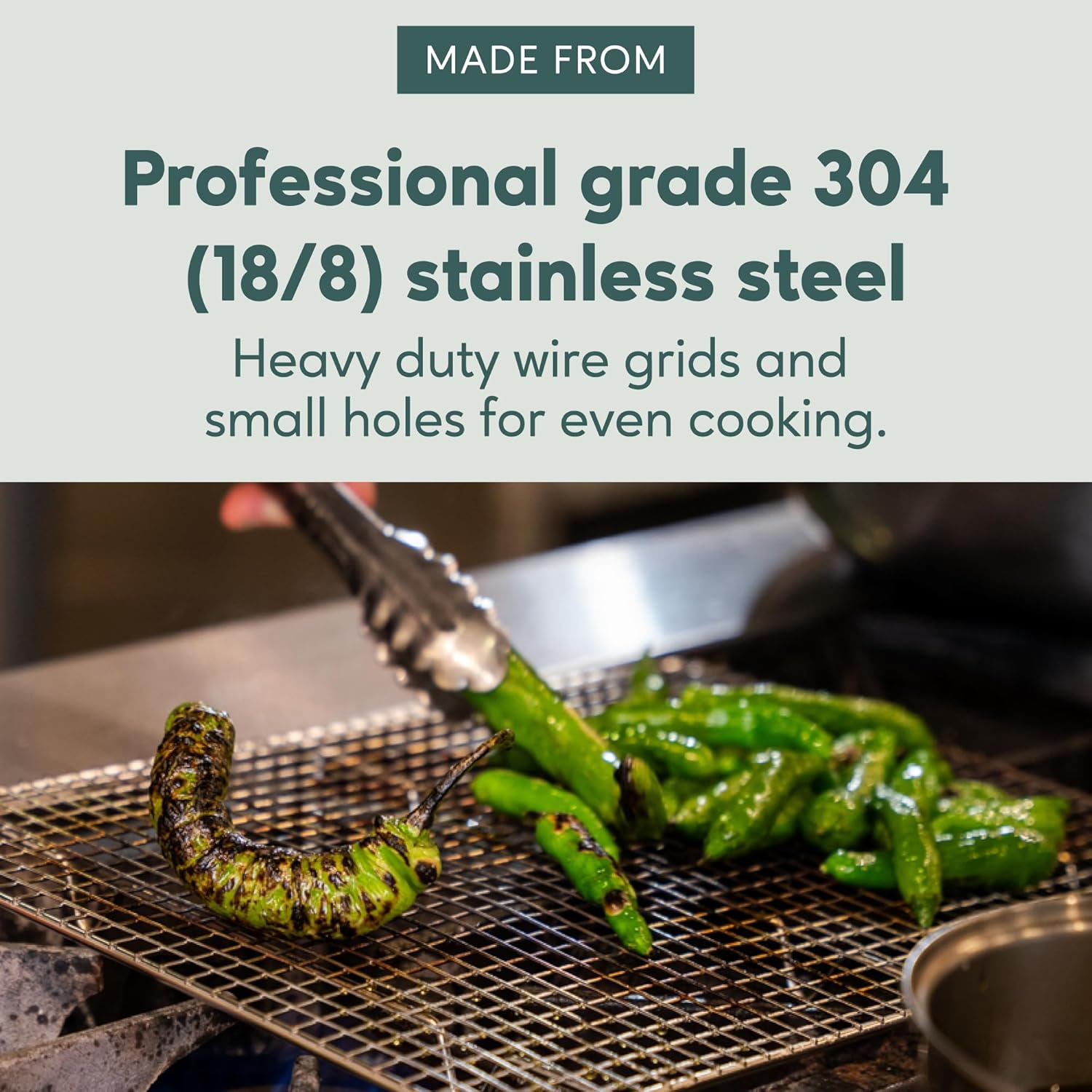 - HEAVY DUTY STAINLESS STEEL, STURDY DESIGN: Small cooling rack for jelly roll baking pans are food-safe, professional grade 304 (18/8) stainless steel with strong, heavy duty wire grid, small holes, smooth no-snag edges, and a full 1 inch height resulting in greater all around airflow for even cooking, cooling and roasting every time