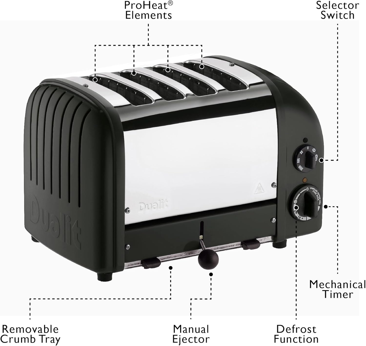 - CLASSIC STYLE MODERN PERFORMANCE - With defrost settings, a mechanical browning control dial, an easy to remove and empty crumb tray and Dualit very own ProHeat elements, we have combined the classic, timeless looks of the iconic Dualit brand with up to date, energy efficient technology.