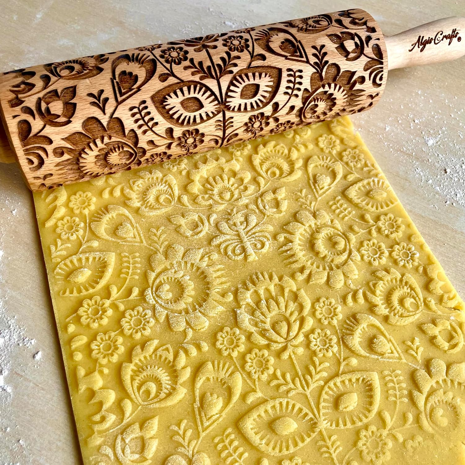 FOLK Embossed Rolling Pin. Wooden Embossing Rolling Pin With Folksy Flowers for Pottery and Cookies by Algis Crafts