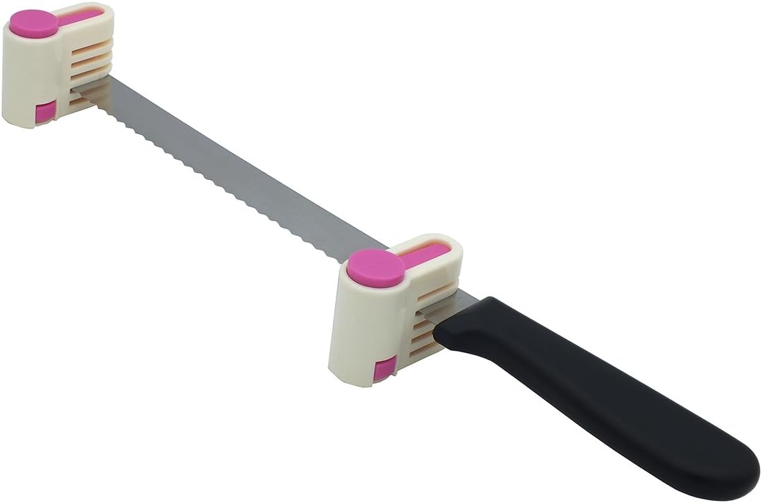 - Operation is very simple. press two button of slicer to clamp knife blade at same layer. Move the blade horizontally at flat surface. You can get perfect uniform cake or toast slice at anywhere.