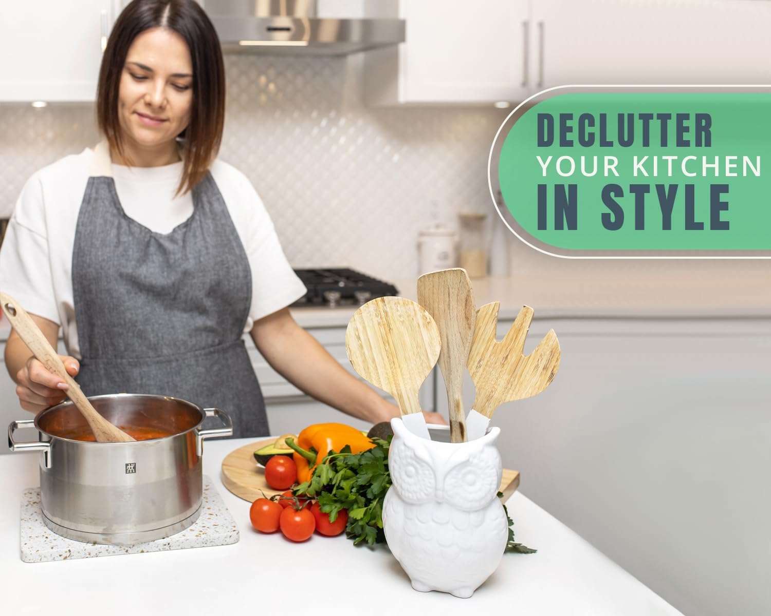 Comfify Owl Utensil Holder Decorative Ceramic Cookware Crock & Organizer, in Lovely White Color - Utensil Shaped Caddy and Perfect Kitchen Ceramic Decor Gift for Countertop - 5” x 7” x 4” Size