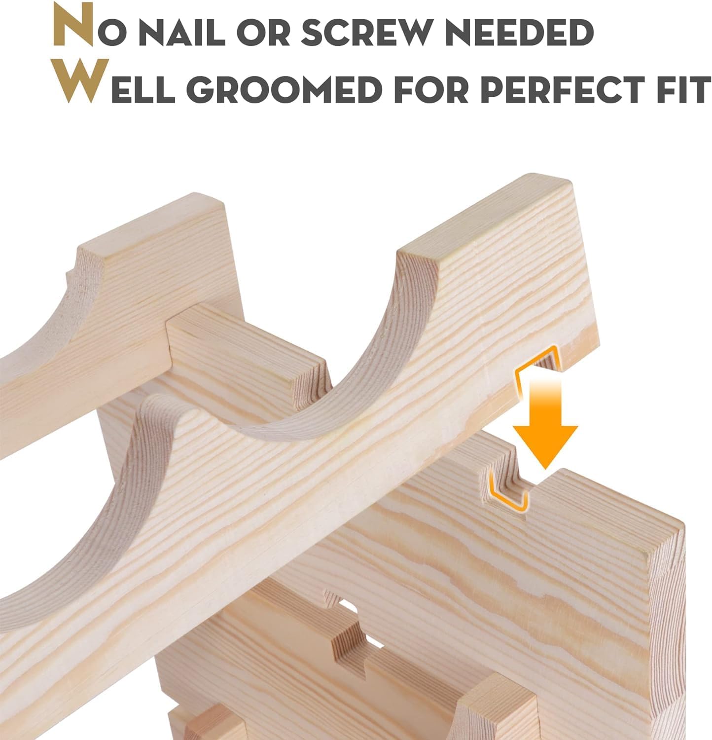- 【Solid Pine Wood - Sturdy & Wobble-Free】This wine bottle holder is made of high quality knots free pine wood to ensure sturdy construction and compact capacity. The thickness of this hardwood is 0.71 inch, smooth and solid material to ensure your wines' safety for long time usage. Unfinished natural wood offers a variety options to stain, paint, varnish to match your furnishings or just leave as it is, 100% DIY and wobble-free guarantee