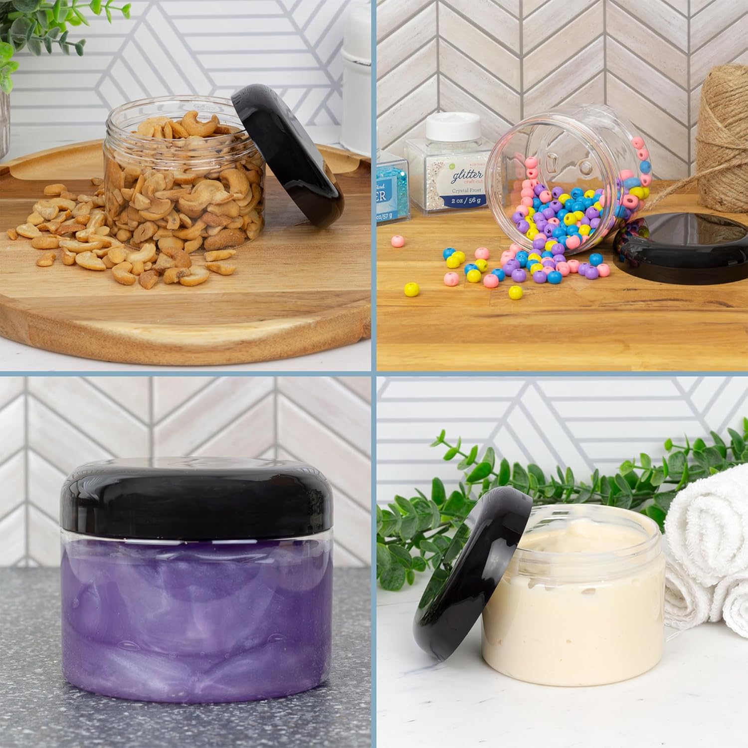 Cornucopia Brands 12 Ounce Clear Plastic Jars w/Black Plastic Lids (6-Pack); BPA Free PET Stackable Canisters for Bathroom & Kitchen Storage
