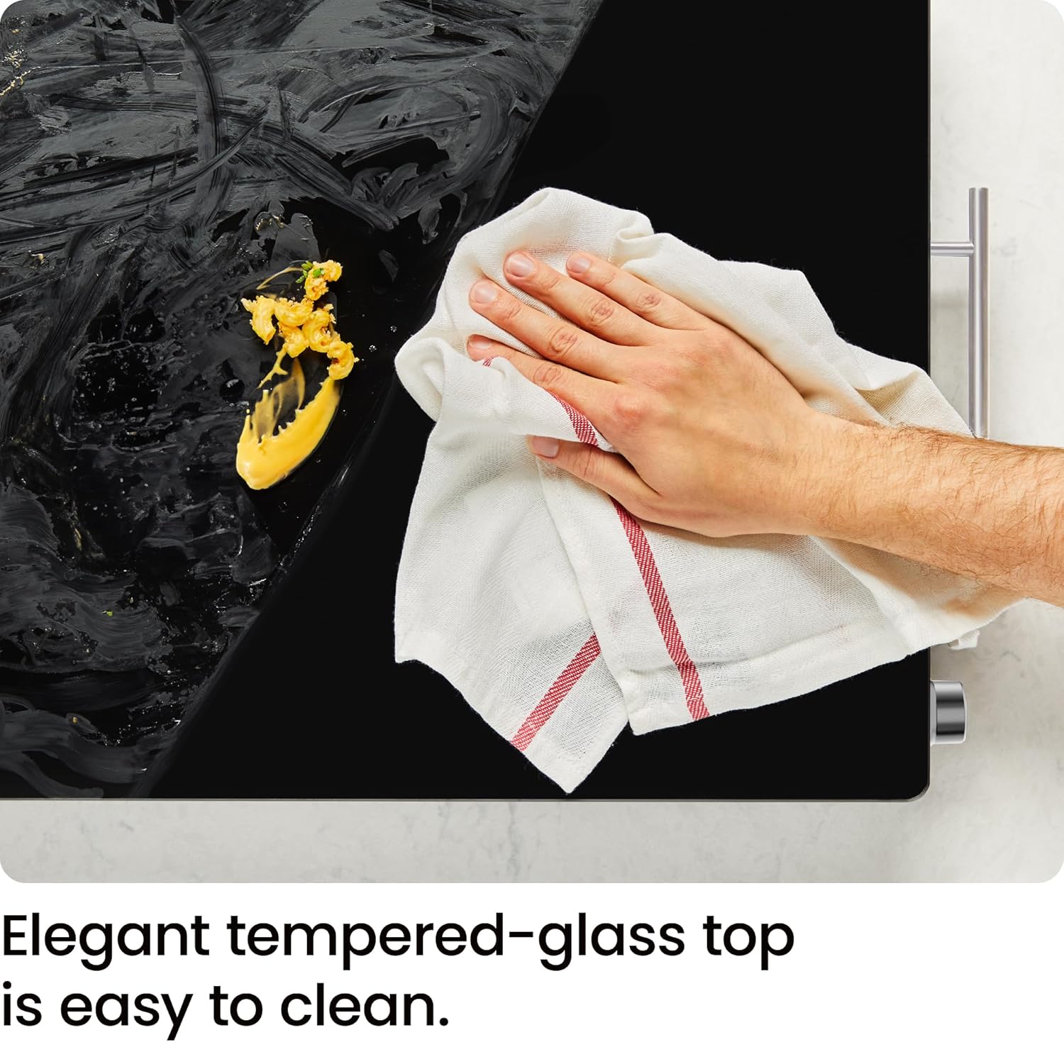 - SLEEK GLASS TOP: Sleek space saving design with black tempered glass top and stainless steel accents looks great on any table or buffet. Revolutionary glass plate design makes cleaning a breeze.