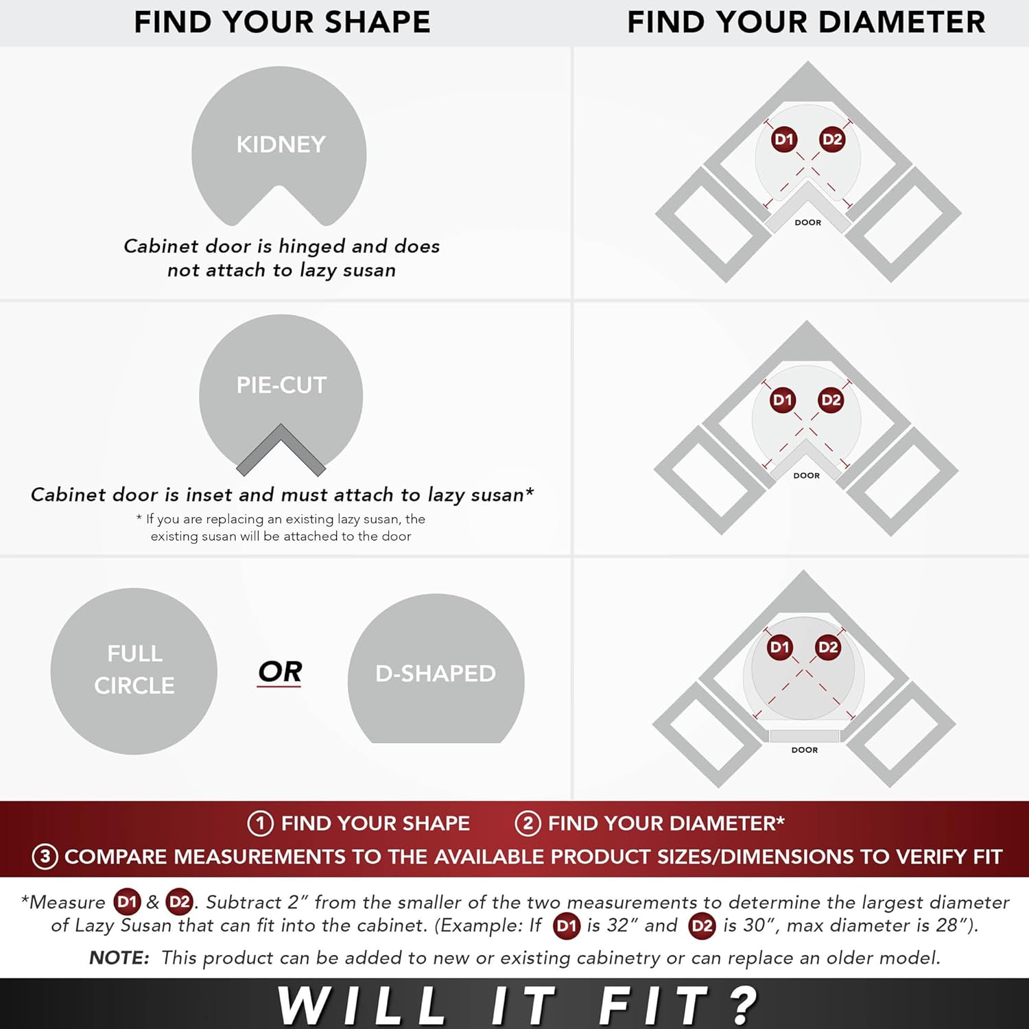 - Install: All pie-cut lazy susans are designed to have a custom door mounted to trays for proper installation. All two-shelf lazy susans for wall or base corner cabinets must first be assembled inside of the cabinet before final installation. If your door is hinged, you most likely need kidney shelves and not pie cut.