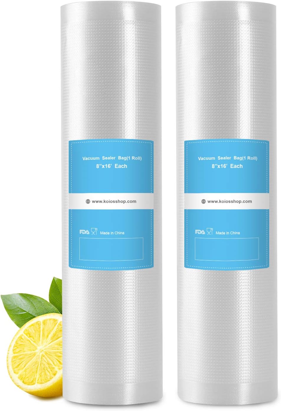 - GREAT VALUE: KOIOS vacuum bags heavy-duty 8" by 16-foot 2 rolls with embossed channels increase the suction, help to ensure a tight seal. Custom size bags eliminating freezer burn and dehydration while maintaining food fresh yet flavorful. No pre-cut design. The less food wasted, the more money you save