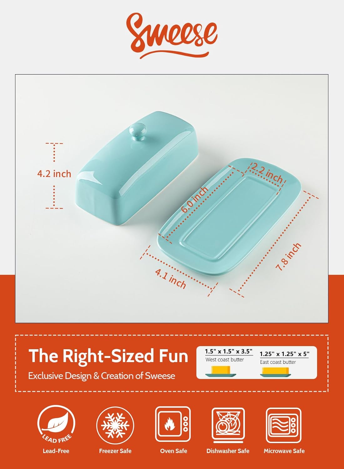 - Elegant & Minimalist Style - The Sweese butter dish is clean, pure, and has a smooth and shiny appearance, which complements the kitchen. The elegant and simple curved design makes the butter keeper look very high-end and fits perfectly with any decoration style. Butter dishes are available in various colors and can be easily combined with other cookware to create a rich and harmonious color ambiance.