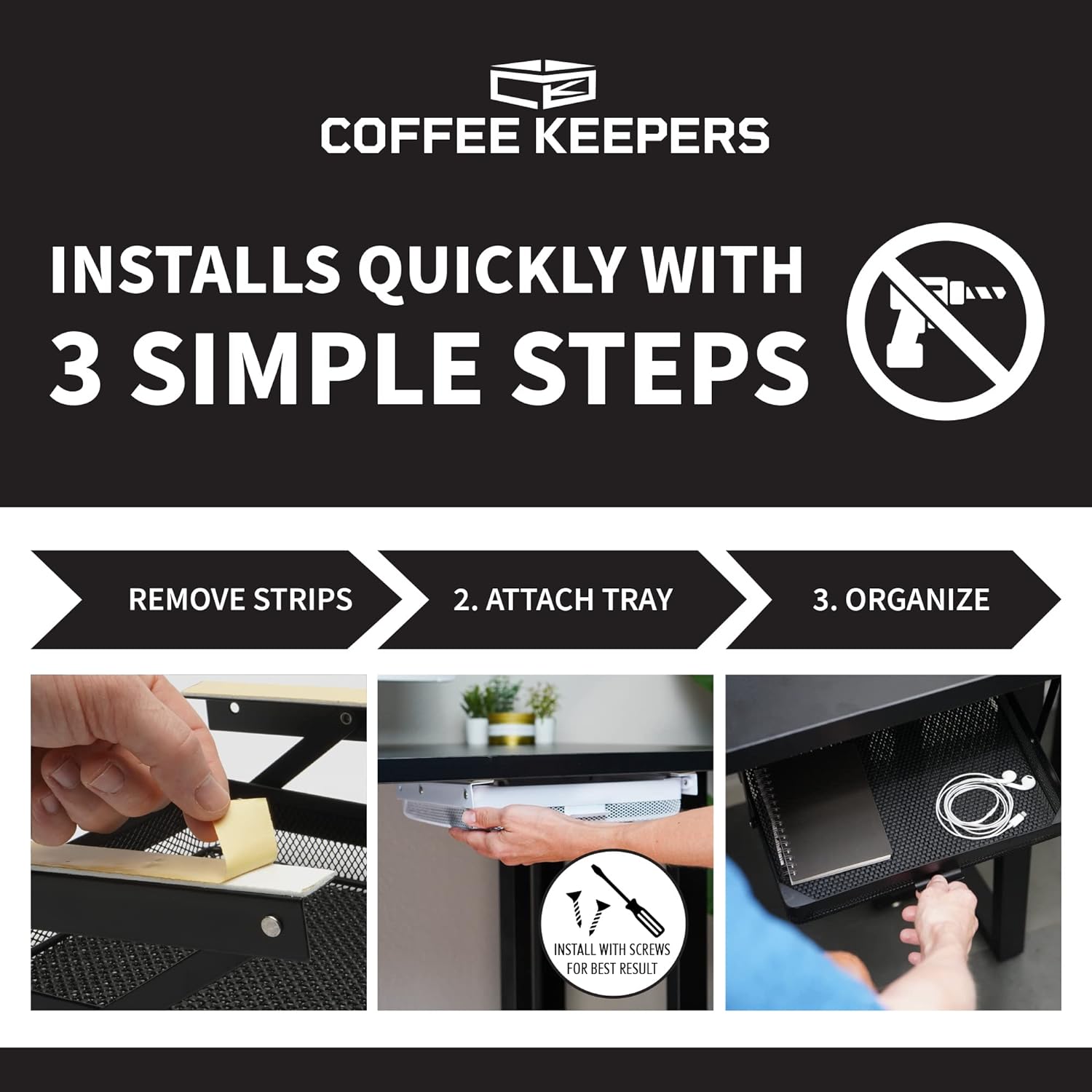 - Clutter Be Gone: Install the handy Everything Keeper under your desktop at work or in your home office to permanently eliminate disruptive clutter. This storage solution makes an effective organizer for all the small-but-necessary accessories that used to take up space on your work surface. You’ll appreciate the fresh space, clarity, & organized feel, perhaps even getting more work done in a timely manner.