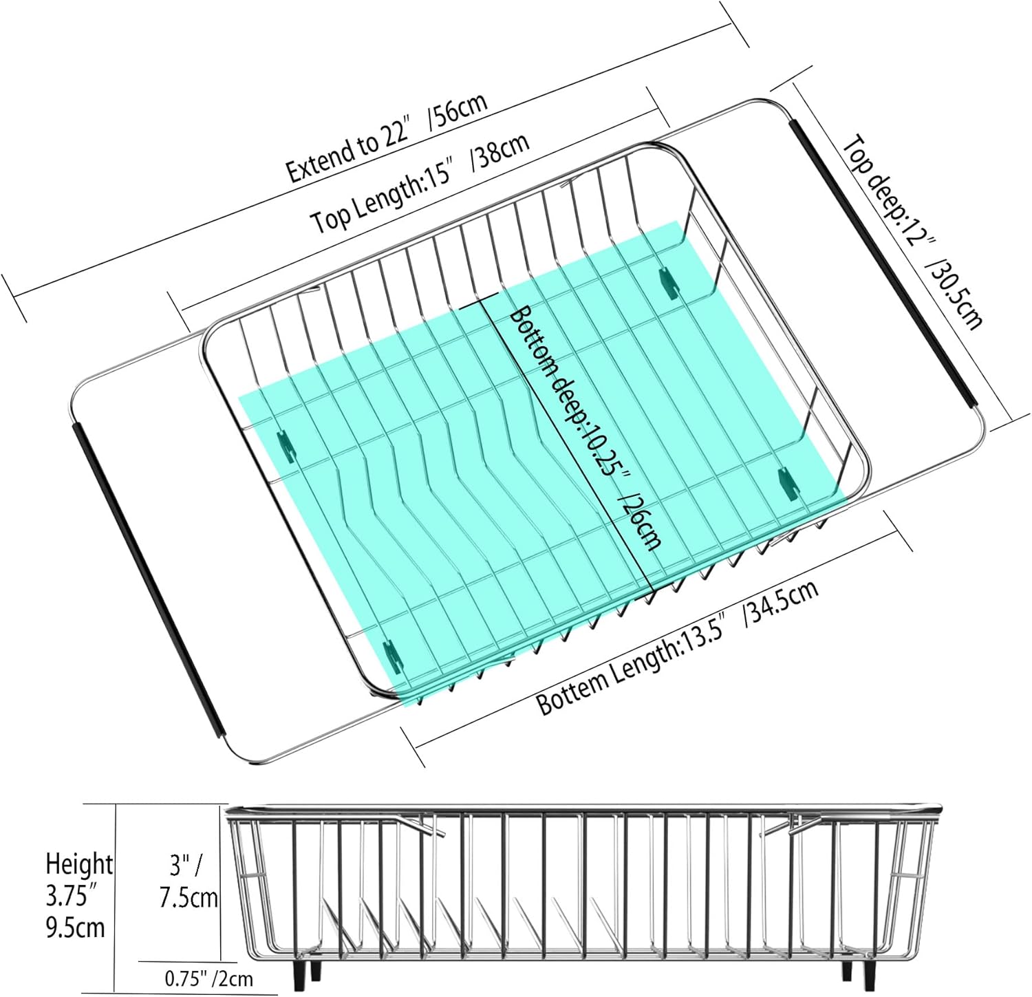 - SIZE DETAILS - Please check the picture 2. Drain basket Height:3.75". length and depth of top of basket:15in x 12in, Length and depth of bottom of basket:13.5in x 10.25in ; Drain basket arm extends 15 to 22 inches long and it can place over the sink measuring between 16 to 22 inches and more than 12.5 inches deep. With extendable arm, it can be used over the sink, on the countertop or in the sink to save space in compact kitchens.