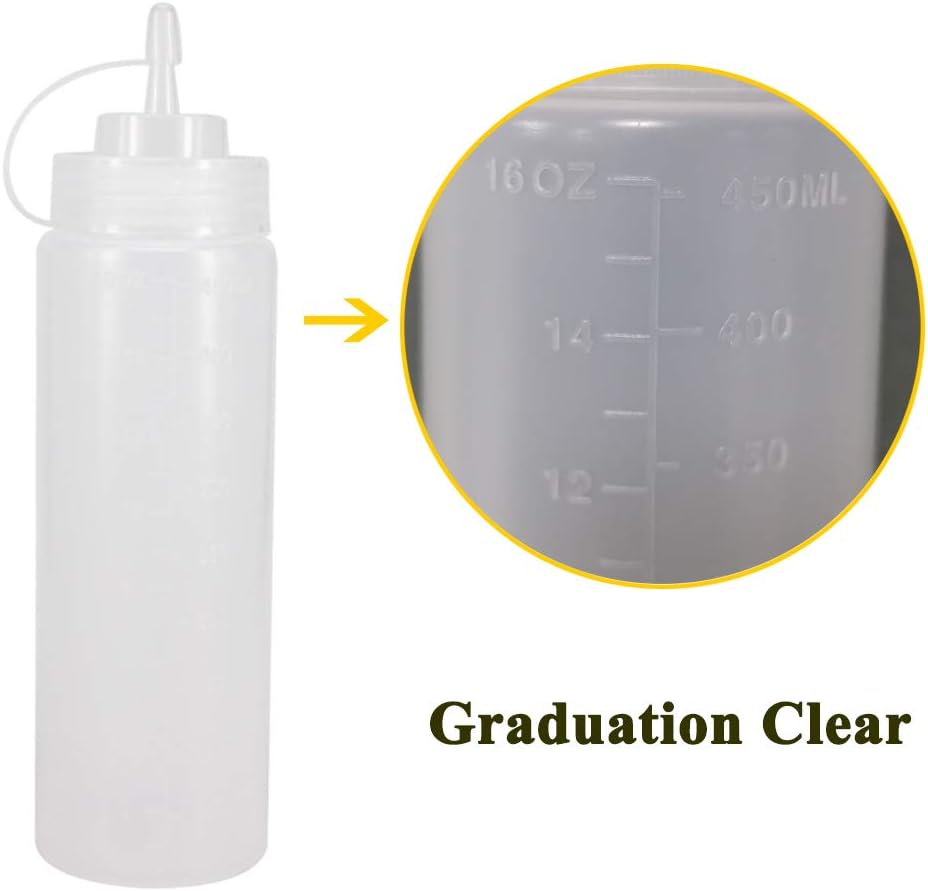 - Package Contains: 8 pack of 16 oz (470ml) upgraded squeezable squirting bottles with extra 8 Chalk Labels, 1 Pen, 1 Silicone Funnel. The scale on the bottle is: 16oz higher than 450ml. When you full with bottle, it capacity is 500 ml(17 oz).