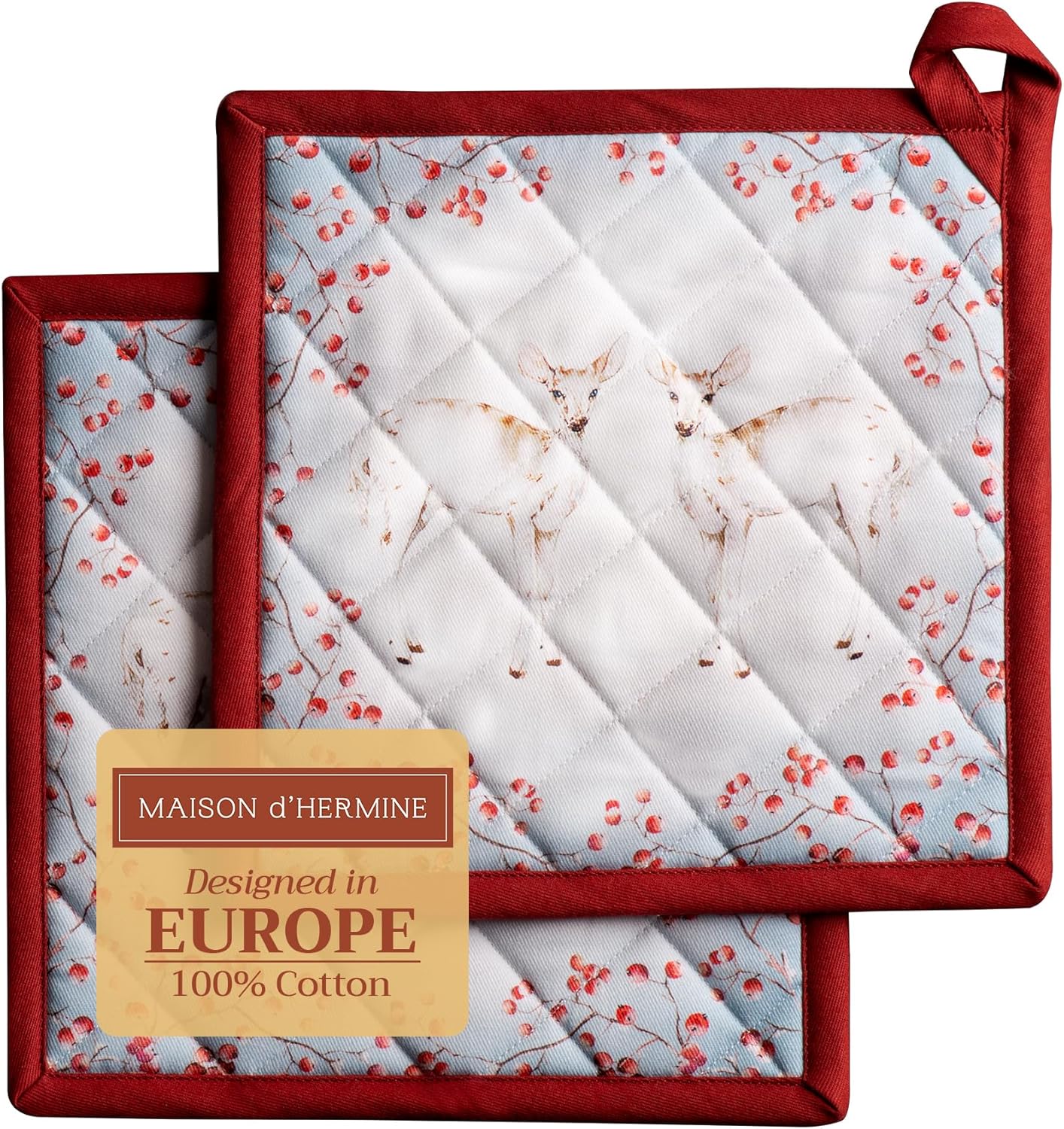 Maison d' Hermine Pot Holders Set 100% Cotton Heat Resistant Potholders 8" x 8" Hot Pads with Loop BBQ, Cooking, Baking, Grilling, Kitchen, Handling Hot Pans (Pack of 2, Fairytale Forest)