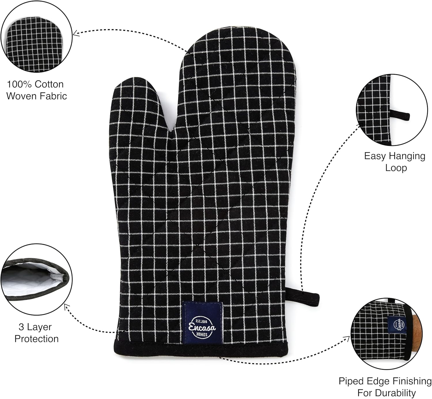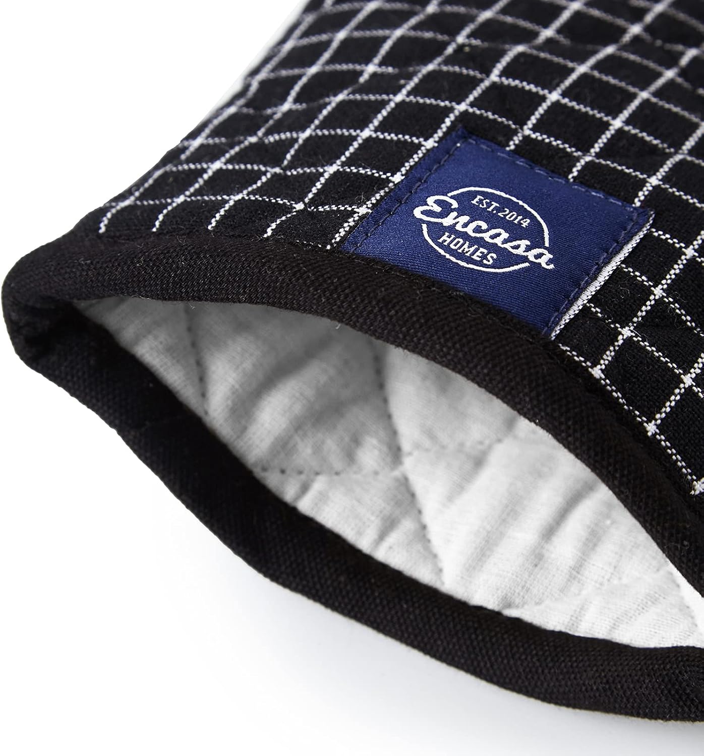 Encasa XO Long 12"x7" Oven Microwave Hand Gloves Mitts (2 pc Set) for Kitchen Cooking & Baking - Heat Resistant, Thick & Safe, Protection of Hands from Hot Utensils - Butcher Checks Black