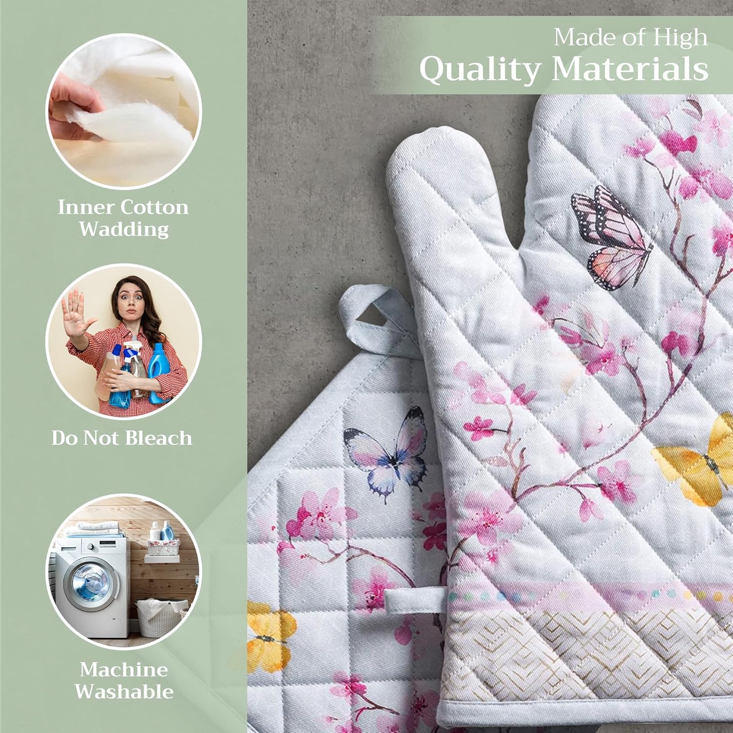 Maison d' Hermine 100% Cotton Oven Mitt & Pot Holder Set (7.5"x13" & 8"x8") Heat Resistant BBQ Cooking Gloves with Loop, Baking, Grilling, Kitchen, Handling Hot Pans Spring/Summer (Blossoms In Spring)