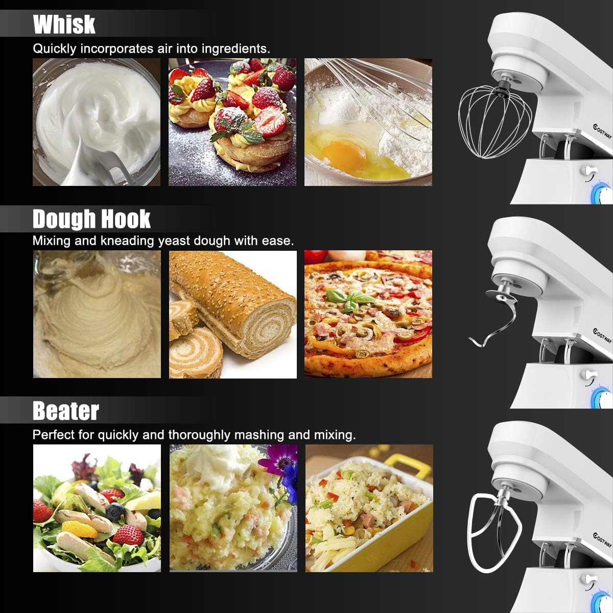 - 3 DIFFERENT ATTACHMENTS FOR VERSATILE USAGE------Featured with 3 different attachments( dough hook, beater, whisk), it is perfectly designed for you to do all types of food mixing, including creaming, mixing, beating, whipping, kneading. You can now make a wealth of new recipes, from cakes, cookies, to breads.